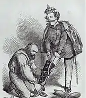 Une grande partie des défenseurs est d'origine étrangère, principalement française (2 500 hommes) et italienne (500 à 700 hommes), sur 6 500 défenseurs seuls 800 sont uruguayens[55]. Voulant habiller le plus économiquement possible sa légion italienne, Garibaldi achète à prix réduit à une entreprise commerciale un lot de tuniques de laine rouge initialement destiné au marché de Buenos Aires alors fermé à cause du blocus : ces chemises rouges étaient à l'origine destinées aux ouvriers des abattoirs et saladeros (en) argentins, leur couleur faisant moins ressortir l'aspect sanglant du travail, aussi Garibaldi pensait-il que les hommes de sa légion qui devaient faire face à une armée de 30 000 hommes ne verraient pas leur sang couler[56]. Cette chemise rouge est un élément essentiel du mythe garibaldien, mais il faut aussi mentionner le chapeau de gaucho et le poncho de la pampa[57].