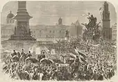 En , de retour à Montevideo alors qu'Oribe en fait le siège jusqu'en 1851, Garibaldi organise et prend la tête d'un groupe de volontaires appelé la Legión Italiana (légion italienne), qui se met au service du gouvernement de Montevideo, le Gobierno de la Defensa (gouvernement de la Défense)[52]. Ces hommes inexpérimentés, qu'il convient de former, font pâle figure lors des premiers combats[53]. Ils se montrent plus aguerris lors du Combate de Tres Cruces (combat des trois croix), le , dans les environs de Montevideo[54].