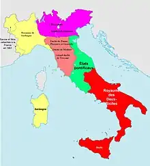 La péninsule italienne est partagée depuis la chute de l'Empire romain en une multitude de petits États indépendants. La Révolution française et la constitution de la République cisalpine puis italienne et le royaume d'Italie (1805-1814) suscitent un sentiment national et républicain[20]. Des mouvements insurrectionnels naissent tels ceux de 1820 et 1831[21]. Garibaldi, comme beaucoup de sa génération, fait l'apprentissage d'une conscience nationale italienne[22].