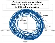 La glace de mer arctique (en superficie et en volume) est en déclin régulier depuis plusieurs décennies, fondant plus vite en été qu'elle ne regèle en hiver. Le quatrième rapport d'évaluation du GIEC (2007) a établi un consensus scientifique sur la cause : principalement le forçage par les gaz à effet de serre. En 2007, ce déclin s'est en outre révélé être plus rapide que prévu par les simulations et modélisations[17]. Une étude de 2011 a suggéré que cela pourrait être lié à une variabilité interne augmentant le déclin de la glace de mer provoqué par les gaz à effet de serre au cours des dernières décennies[18]. Une étude de 2012 basée sur des simulations plus récentes, a également sous-estimé les taux de recul (légèrement inférieurs à ceux réellement observés)[19]. Selon le cinquième rapport d'évaluation du GIEC (2014) le déclin observé depuis 1979 va se poursuivre[20] et la région n'a jamais été aussi « chaude » depuis au moins 4000 ans[21] ; la saison de fonte de l'Arctique s'est allongée d'environ cinq jours par décennie (de 1979 à 2013), dominée par un gel automnal plus tardif[22]. Les changements de glace de mer ont été identifiés comme un mécanisme d'amplification polaire[23].