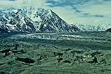 Vue aérienne de la confluence entre le glacier Stairway (à gauche) et le glacier Kaskawulsh (à droite) en 2004. | |