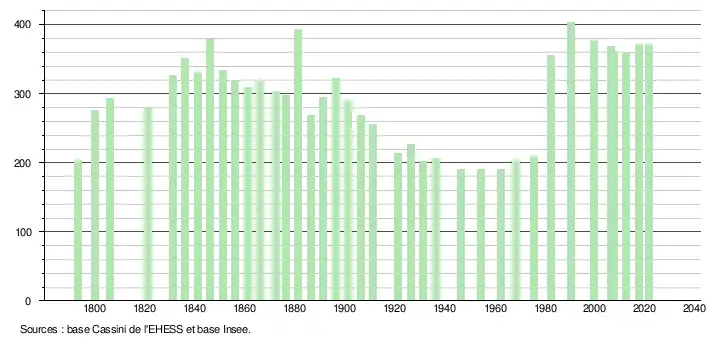 L'évolution du nombre d'habitants est connue à travers les recensements de la population effectués dans la commune depuis 1793. Pour les communes de moins de 10 000 habitants, une enquête de recensement portant sur toute la population est réalisée tous les cinq ans, les populations légales des années intermédiaires étant quant à elles estimées par interpolation ou extrapolation[29]. Pour la commune, le premier recensement exhaustif entrant dans le cadre du nouveau dispositif a été réalisé en 2007[30].