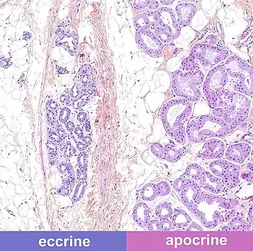 À la différence des glandes apocrines, leur répartition est plus ubiquitaire, leur taille plus petite, leur conduit excréteur débouche directement à l'épiderme et non dans un follicule pileux et leur sécrétion est aqueuse.