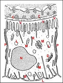 Les cellules sont pourvues de noyaux oblongs tous situés au même niveau et montrent un cytoplasme plus ou moins granuleux, vacuolaire (Fig.2), avec parfois des inclusions jaunâtres, et dont l’aspect évoque une activité glandulaire, sans permettre toutefois de l’affirmer. Les pôles apicaux sont pourvus d'une "brosse", faisceaux de microvilli vraisemblables.
