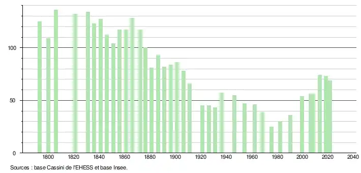 L'évolution du nombre d'habitants est connue à travers les recensements de la population effectués dans la commune depuis 1793. Pour les communes de moins de 10 000 habitants, une enquête de recensement portant sur toute la population est réalisée tous les cinq ans, les populations légales des années intermédiaires étant quant à elles estimées par interpolation ou extrapolation[30]. Pour la commune, le premier recensement exhaustif entrant dans le cadre du nouveau dispositif a été réalisé en 2008[31].