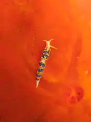 Entourés en rouge, sur la gauche de l'image l'emplacement du pénis, après le premier groupe de cerata, et celui de l'anus, sur la droite de l'image, plus en arrière de l'animal.