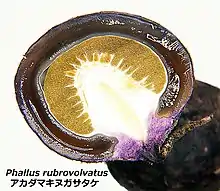 1 Œufs de Phallus impudicus, à gauche, encore entouré de son péridium, à droite en coupe, sans le peridium, on retrouve, en périphérie, une masse gélatineuse translucide, puis en foncé, la future gleba et, au centre, le futur stipe.