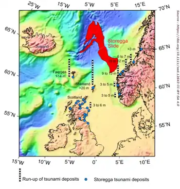 - les îles Féroé : elles étaient alors occupées[réf. nécessaire], et les populations humaines y ont aussi été probablement anéanties. On y trouve encore les preuves du passage du tsunami[54], en particulier dans un lac côtier aujourd'hui situé à 4 m d'altitude sur l'île de Suðuroy dont les profils lithostratigraphiques ont conservé les traces d'un premier tsunami, dévastateur, et d'un second un peu moins puissant, mais qui a érodé une partie des tsunamites laissés par le premier. Dans les couches perturbées, des fragments de coquilles marines et de foraminifères y sont mélangés avec des fragments de bois et des couches de sable fin. L'événement tsunami a été daté entre 7300 et 6400 BP au carbone 14[55] ;