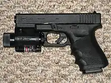 Le Glock 19[5] est un pistolet populaire fabriqué par Glock, reconnu pour sa fiabilité et sa polyvalence. Chambré en calibre 9 mm Luger, il fonctionne avec le système Safe Action et offre une capacité de chargeur standard de 15 cartouches, avec des options de 17, 19, 24, 31, 33, et 10 cartouches. Doté d'un canon de 102 mm (4,02 pouces), il est apprécié pour sa taille compacte, idéale pour le port dissimulé, tout en conservant une capacité de munitions respectable. Sa conception ergonomique et sa précision en font un choix prisé par les forces de l'ordre et les tireurs sportifs