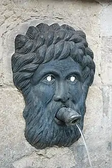 - Gargouille - Trou orné d'un mascaron par lequel l'eau sort d'une fontaine ou d'une cascade[F 10].