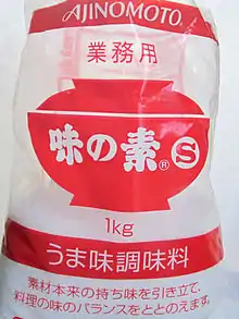 C’est en 1908 que le professeur Kikunae Ikeda isola dans l’algue Saccharina japonica, kombu, l’acide glutamique par extraction aqueuse et cristallisation puis appela son goût « umami »[8]. Il avait remarqué que le bouillon japonais de katsuobushi et de kombu avait un goût particulier qui n’avait pas encore été décrit scientifiquement et qui n’était ni sucré, ni salé, ni acide, ni amer[9]. Pour vérifier que l’acide glutamique ionisé était responsable du goût umami, le professeur Ikeda étudia les propriétés gustatives de plusieurs sels de glutamate tels que le glutamate de calcium, de potassium, d’ammonium et de magnésium. Tous les sels ont engendré l’umami, en plus d’un certain goût métallique dû aux autres minéraux. Parmi ces sels, le glutamate de sodium était le plus soluble et le plus savoureux, et se cristallisait facilement. Le professeur Ikeda a appelé ce produit glutamate monosodique et a soumis un brevet pour produire le GMS[10]. Les frères Suzuki lancèrent la production commerciale de GMS en 1909 sous le nom d’ AJI-NO-MOTO, qui signifie « Essence du goût » en japonais ; c'était la première fois que du glutamate monosodique était produit dans le monde[11],[12],[13].