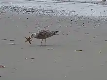 Le goéland recherche souvent sa nourriture en marchant ou parfois en courant. Sa démarche est aisée, à peine dandinée, ses pas sont amples et ses enjambées font plus de 15 cm de longueur[1].