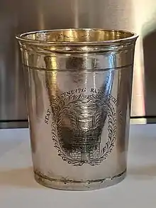 - Le gobelet porte le poinçon du maître, un aigle avec les armoiries d'Obernai et l'inscription HERR MICHAËL STAHL BURGMEISTER 1742 RATHS BECHER DER STADT OBEREHNHEIM. Il est conservé à l'hôtel de ville d'Obernai. cf« Gobelet de magistrat », Inventaire du Grand-Est