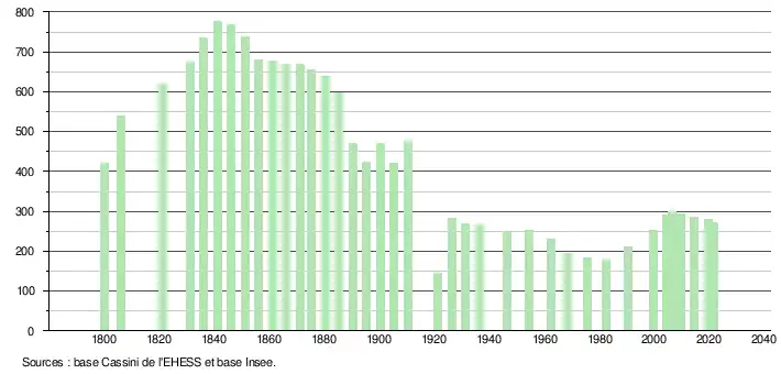 L'évolution du nombre d'habitants est connue à travers les recensements de la population effectués dans la commune depuis 1800. Pour les communes de moins de 10 000 habitants, une enquête de recensement portant sur toute la population est réalisée tous les cinq ans, les populations légales des années intermédiaires étant quant à elles estimées par interpolation ou extrapolation[24]. Pour la commune, le premier recensement exhaustif entrant dans le cadre du nouveau dispositif a été réalisé en 2004[25].