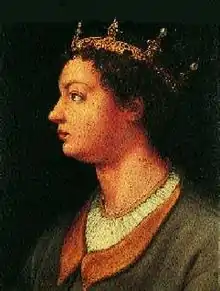 Roi de Naples; désigné pour aider Innocent VII contre le soulèvement romaina[8]. Battu à la bataille de Roccasecca en 1411, il abandonne le pape Grégoire XII en faveur de l'antipape Jean XXIII , qui le nomme gonfalonier de l'église[9]. |