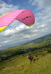 - Si tout lui semble bon, il commence à courir en faisant de grands pas afin de secouer le moins possible l'aile et ainsi éviter de lui faire perdre de la portance. Quand il atteint environ 30 km/h (vitesse air), l'aile a une portance suffisante pour supporter son poids et il s'envole si la pente est supérieure à l'angle de vol de sa voile. C'est la phase de décollage proprement dit.