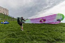 - Il commence à avancer dans la pente en se penchant en avant afin de tirer en premier le bord d'attaque de l'aile. Le fait qu'il ait les élévateurs A en main facilite la montée du bord d'attaque. Il doit donner une impulsion suffisante pour que l'aile se gonfle et monte au-dessus de lui. Un peu avant que l'aile soit au-dessus de sa tête, il lâche les élévateurs. C'est la phase de gonflage, ou construction de l'aile.