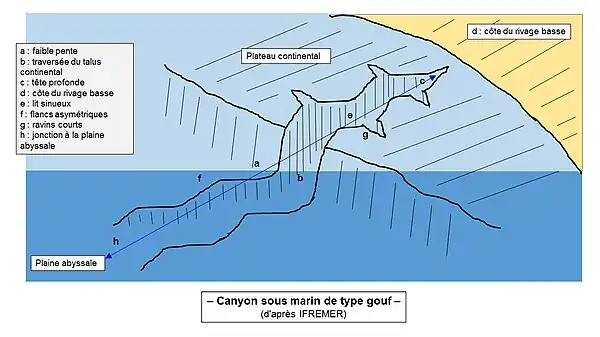 Un gouf est un entaille profonde du talus continental ayant une extrémité proche du littoral.