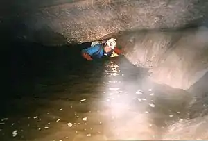 La progression est bloquée à 6,3 km de l'entrée par un grand chaos (repère 26) situé sous la grande doline du Loze de Flaujac-Gare.