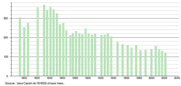 L'évolution du nombre d'habitants est connue à travers les recensements de la population effectués dans la commune depuis 1793. Pour les communes de moins de 10 000 habitants, une enquête de recensement portant sur toute la population est réalisée tous les cinq ans, les populations légales des années intermédiaires étant quant à elles estimées par interpolation ou extrapolation[21]. Pour la commune, le premier recensement exhaustif entrant dans le cadre du nouveau dispositif a été réalisé en 2006[22].