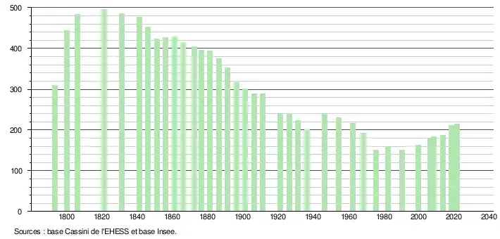 L'évolution du nombre d'habitants est connue à travers les recensements de la population effectués dans la commune depuis 1793. Pour les communes de moins de 10 000 habitants, une enquête de recensement portant sur toute la population est réalisée tous les cinq ans, les populations légales des années intermédiaires étant quant à elles estimées par interpolation ou extrapolation[25]. Pour la commune, le premier recensement exhaustif entrant dans le cadre du nouveau dispositif a été réalisé en 2008[26].