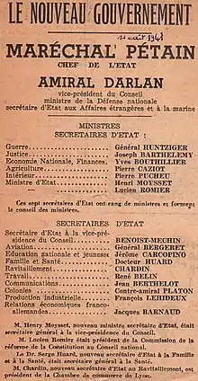 - Chef de l'État Français, président du Conseil[1] : maréchal Philippe Pétain.