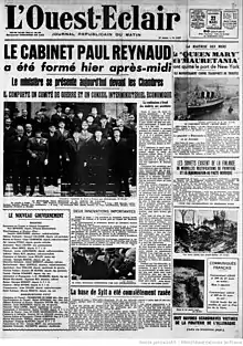 À la suite de la guerre d'Hiver contre la Finlande lancée par l’URSS[4], et de la non-intervention de la France, le gouvernement Daladier est renversé le . Le président Albert Lebrun nomme Paul Reynaud le , président du Conseil et ministre des Affaires étrangères. Édouard Daladier est néanmoins présent en tant que ministre de la Défense nationale et de la Guerre dans le cabinet de son successeur.