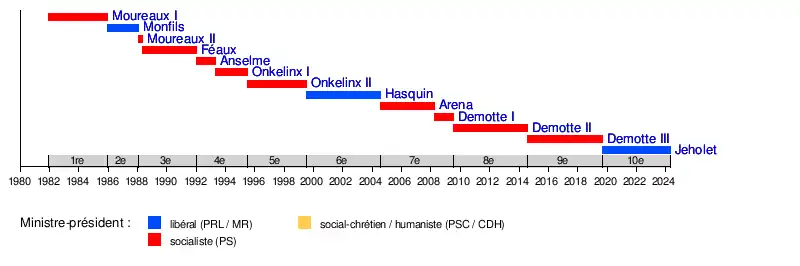 | 10e législature | Gouvernement Jeholet | Depuis le (4 ans, 6 mois et 28 jours) |