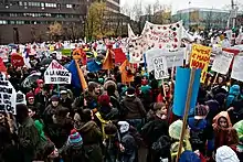 La manifestation étudiante du a rassemblé entre 100 000 et 200 000 étudiants et membres de la société civile[89],[90] s'opposant à la hausse des frais de scolarité prévue par le gouvernement de Jean Charest au centre-ville de Montréal. Elle avait comme point de départ la Place du Canada et se terminait sur la Place Jacques-Cartier dans le Vieux-Port où les leaders étudiants ont tenu plusieurs discours.