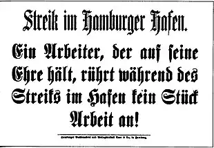 Pour maintenir dans l'urgence l'activité du port et pour saper le pouvoir de lutte des grévistes, les entrepreneurs recrutent des briseurs de grève en Allemagne et à l'étranger. Le 7 décembre 1896, près de 2 000 briseurs travaillent dans le port[31]. Mais les entrepreneurs n'atteignent leur but que partiellement : les piquets de grève persuadent certains briseurs d'abandonner leur emploi. La productivité de ces remplaçants est en outre bien plus faible, car ils connaissent à peine les tâches du travail portuaire. Albert Ballin, directeur de la Compagnie transatlantique Hambourg-Amérique (HAPAG), considère que seule la moitié de ces forces d'appoint embauchées par sa compagnie est utilisable[32]. Sur les quais et dans les entrepôts règne un état de chaos. Le nombre de bateaux attendant d'être chargés ou déchargés croît sans cesse. Les conséquences pour les autres branches de l'économie sont substantielles, car ces dernières manquent désormais de matières premières et de pièces détachées, qui s'amoncellent sur les navires, sur les quais et dans les entrepôts. Des réclamations pour retard de livraison arrivent de toute part.