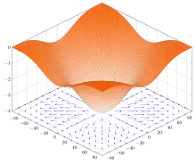 Pour une fonction , le gradient de f se confond avec la dérivée de f. Pour une fonction , où n est un nombre entier ≥ 2, le gradient de f en un point est un vecteur dont la direction est celle de la variation la plus forte de f au voisinage de ce point[2]. Cette notion est liée à celle de différentielle pour des fonctions à valeurs réelles : si f est différentiable en a, la différentielle Df(a) est une forme linéaire ; à cette forme linéaire, si l'ensemble de départ E est de dimension finie, on peut associer un vecteur qui est le gradient de f en a.
