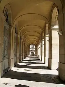 La galerie de la façade principale est constituée d'une voûte plate à caissons. Afin de récupérer les efforts aux extrémités de la galerie, les deux caissons extrêmes possèdent des pierres taillées en diagonale et des tirants métalliques. Ainsi l'architecte Victor Louis a mis en place une armature en fer dans les deux caissons d'angle, non visible, afin de relier les colonnes et l'architrave au mur de la façade. Ce dispositif constructif novateur permet de reporter les efforts vers les murs latéraux et ainsi évite la construction d'une culée. Ce principe, similaire à celui du futur béton armé, est appelé le clou de Louis [9].