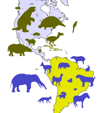 La migration du Nord au Sud est illustrée par deux carnivores, un grison (Galictis, Mustelidae) et un renard († Dusicyon, Canidae), deux équidés († Hippidion et † Onohippidium) et peut-être un gomphotère (pachyderme préhistorique semblable aux éléphants). Celle du Sud au Nord est marquée par trois familles de tatous, Dasypodidae (Dasypus), Pampatheriidae († Holmesina (en)) et Glyptodontidae[note 2] († Pachyarmatherium (en)), et par un paresseux terrestre géant († Eremotherium, Megatheriidae)[50].