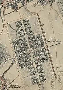 Les premiers plans du jardinier Martin Göttler dessinent un rectangle d'1,9 km2 avec le palais de Jean-Georges III en son exact milieu, tandis que le parc est délimité par un canal l'entourant, mais Johann Friedrich Karcher modifie les plans lorsqu'il devient jardinier principal (Obergärtner) de 1683 à 1722, s'inspirant du style français. Le jardin est alors dessiné en forme de croix avec des allées diagonales et secondaires. En 1693-1694, il dessine les plans de huit pavillons (Kavaliershäuser) reliés entre eux par des chaînes et des murets et fermant un premier jardin rectangulaire entourant directement le palais. En 1694, Auguste le Fort monte sur le trône et les travaux du parc parviennent à leur terme. Cependant la Grande Guerre du Nord provoque le siège de Dresde par les Suédois en 1706, Auguste le Fort perdant son trône de Pologne, jusqu'en 1709. Le parc est restauré est illuminé de mille feux pour la venue du roi Christian IV de Danemark pendant un mois à l'été 1709. On y donne des feux d'artifice, des mascarades, un bal des dames, un bal des quatre continents[2], etc. qui nécessitent la construction de décors temporaires dessinés par Karcher.