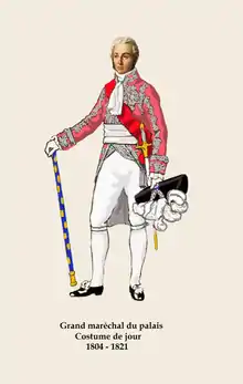 L'habit de cour de grand maréchal du palais suit la réglementation officielle. Il reprend la forme du petit costume, créé par Isabey et porté par l'empereur lors de son sacre le . Il est en velours de soie amarante avec des broderies argent. Ces obligations sont loin d'être gratuites puisque le titulaire est obligé de commander et de payer lui-même ses habits.