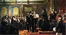 La reine Marie-Christine d'Autriche jurant sa fonction de régente d'Espagne devant le grand notaire du Royaume.