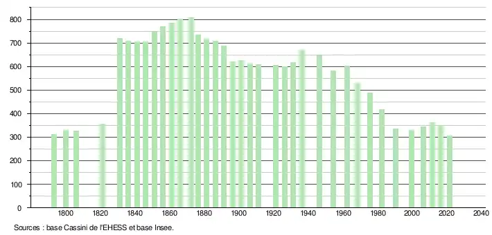 L'évolution du nombre d'habitants est connue à travers les recensements de la population effectués dans la commune depuis 1793. Pour les communes de moins de 10 000 habitants, une enquête de recensement portant sur toute la population est réalisée tous les cinq ans, les populations légales des années intermédiaires étant quant à elles estimées par interpolation ou extrapolation[22]. Pour la commune, le premier recensement exhaustif entrant dans le cadre du nouveau dispositif a été réalisé en 2006[23].