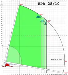 L'arc de cercle extérieur indique que ce modèle peut être déployé à 28 mètres dans toutes les positions, à la condition que le parc d'échelle soit en appui. Sans appui et avec un charge sur le parc, la projection du centre de gravité serait en dehors de la zone de sustentation, cela impliquerait obligatoirement la bascule du véhicule.