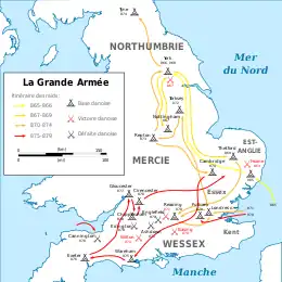 À la fin de 866, l'armée fit la conquête du royaume de Northumbrie, suivi en 870 de celui d'Est-Anglie. En 871, arriva de Scandinavie la Grande Armée d'été[3], conduite par Bagsecg. En 874, les hommes de la Grande Armée païenne, ainsi renforcée, purent conquérir la Mercie, chassant le roi Burgred. La même année, un grand nombre d'entre eux s'établirent dans les territoires conquis, suivis en 877 par un autre groupe. Des preuves de leur séjour ont été apportées par le charnier de 250 corps découvert à Repton et par la cinquantaine de tumuli trouvés non loin de là, à Ingleby, dans le Derbyshire[4].