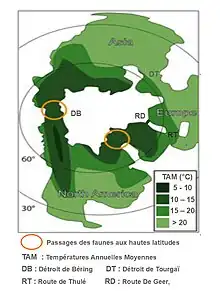 - à l'abaissement du niveau marin de plus de 50 mètres qui facilite les communications entre les continents et le mélange des espèces animales et végétales[7].