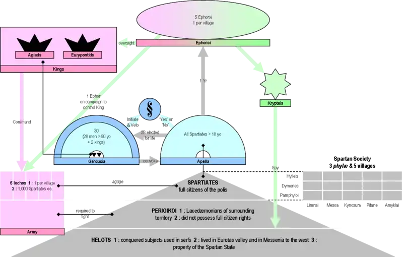 Dans son poème, Tyrtée évoque la royauté, une assemblée (Gérousia) et un conseil populaire (ecclésia ou apella). L'objectif de cette constitution est d'atteindre l'eunomia.