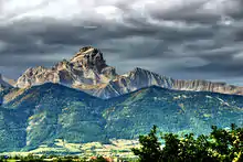 Vue de l'Obiou depuis la route Napoléon (RN 85) aux environs de Corps. | |