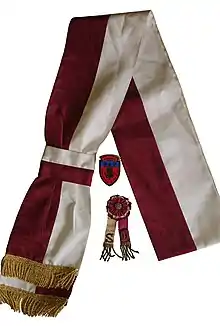 L’écharpe amarante et blanche, frangée d’or de la confrérie est passée en sautoir sur l’épaule droite.