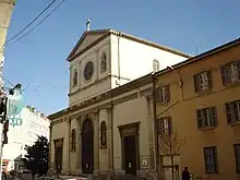 Vue de la rue sur l'église Notre-Dame Saint-Louis de la Guillotière. | ||||
