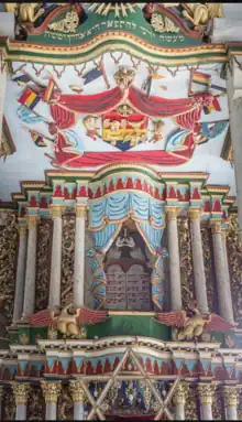 L'intérieur du bâtiment possède un sol en bois brut. L'ensemble est décoré avec talent et une certaine sensibilité artistique dans un style éclectique, essentiellement baroque, presque monumental[3]. Les murs intérieurs sont peints de fresques murales représentant l'Eretz-Israël, effectuées par des peintres qui ne s'y sont jamais rendus[4],[2].