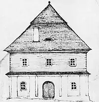 Le contraste entre le niveau inférieur blanchi à la chaux et le bois foncé de la partie supérieure donne un aspect particulier à l'édifice, et les avant-toits des murs ainsi que les pilastres, introduisent une rythmicité distincte. Devant l'entrée principale, se trouve une clôture en bois faite de planches et un portail entre des linteaux en briques blanchis à la chaux. Sur la photographie ci-jointe, datant des années 1920, on aperçoit également à gauche, une petite extension attenante en planches, recouverte d'un toit à une seule pente, chauffée par un poêle, comme en témoigne la cheminée en brique.