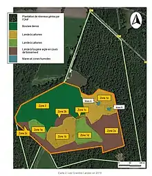 - 5,5 ha ont été déboisés pour permettre la réinstaller des plantes caractéristiques des landes atlantiques humides. Les zones 1a, 1b et 1c (voir la carte ci-contre) ont été restaurées en 2013 et les zones 1d et 1e l'ont été en 2018.