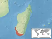 Cette espèce est endémique du Sud de Madagascar[1],[2]. Elle se rencontre de la région de la Forêt des Mikea à Petriky dans les régions d'Atsimo-Andrefana, d'Androy et d'Anosy entre le niveau de la mer et 320 m d'altitude.