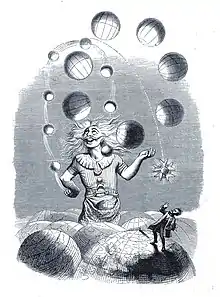 « La planche où il se représente lui-même en jongleur de mondes est emblématique de sa posture artistique de clown mais aussi de démiurge dont la « manière de faire des mondes » jongle de la science à l’humour et à la poésie[13]. »