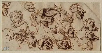 Les caricaturistes s’inspirent particulièrement de la physiognomonie, un courant intellectuel inspiré des travaux de Lavater, de Cuvier, de Geoffroy Saint-Hilaire et de Gall qui postule l’analogie entre les traits du visage, la complexion d’un individu et son caractère, sa personnalité. Cette thèse et les courants analogues (craniologie, phrénologie, etc.) alors en vogue ont une répercussion indubitable sur la pensée et l’œuvre de Grandville[7]. Il élabore d’ailleurs un commerce fructueux en vendant des planches comiques où sont dessinées plusieurs têtes de formes différentes (L’Animalomanie, Étude phrénologique).